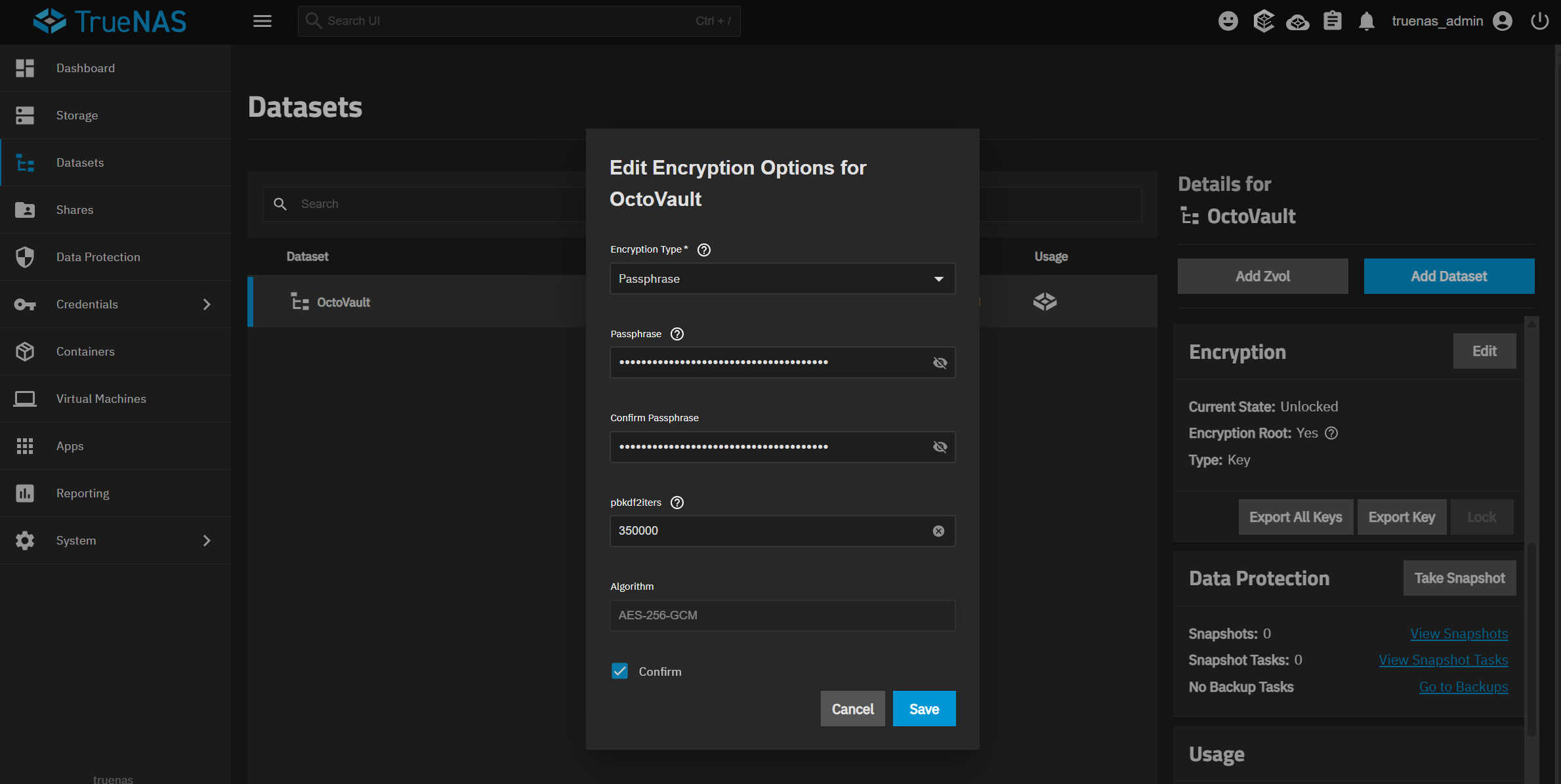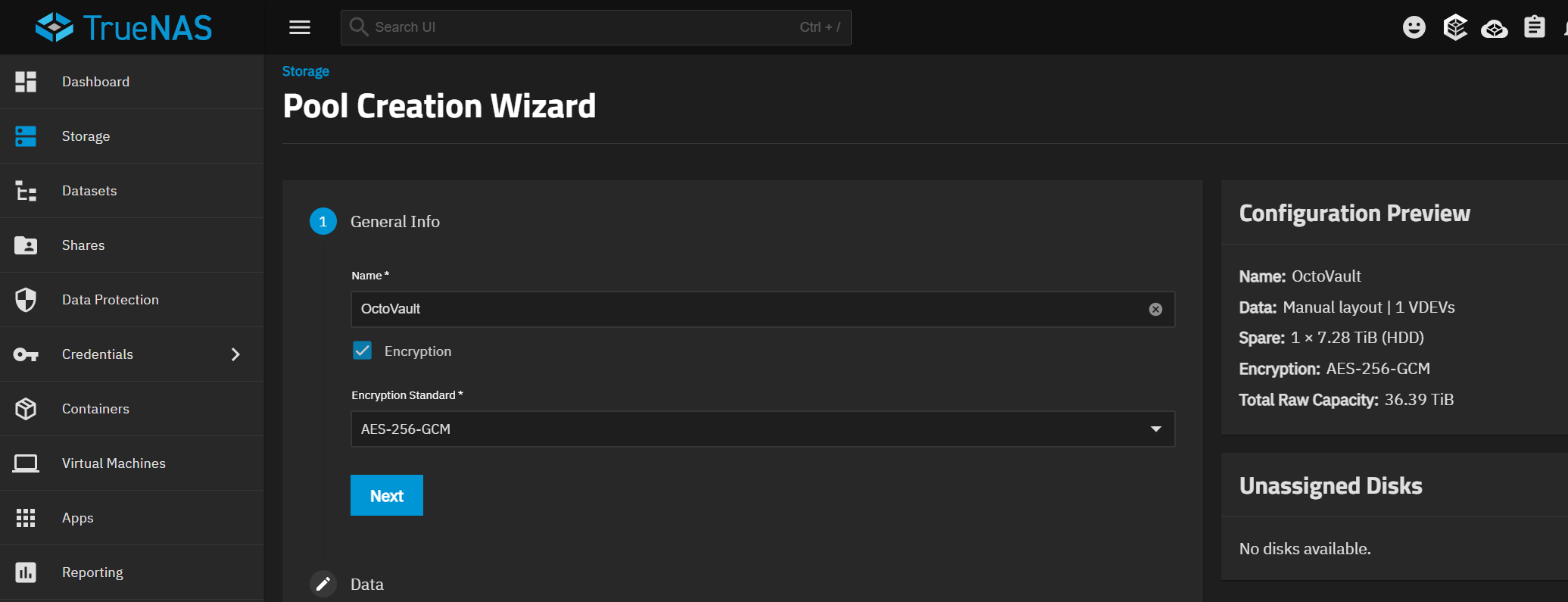 I will name the pool "OctoVault" (from 8 drives) and I will enable AES-256-GCM encryption with a passphrase stored on my YubiKey. TrueNAS supports native ZFS dataset encryption using AES-256-GCM, which is a high-performance authenticated encryption mode.