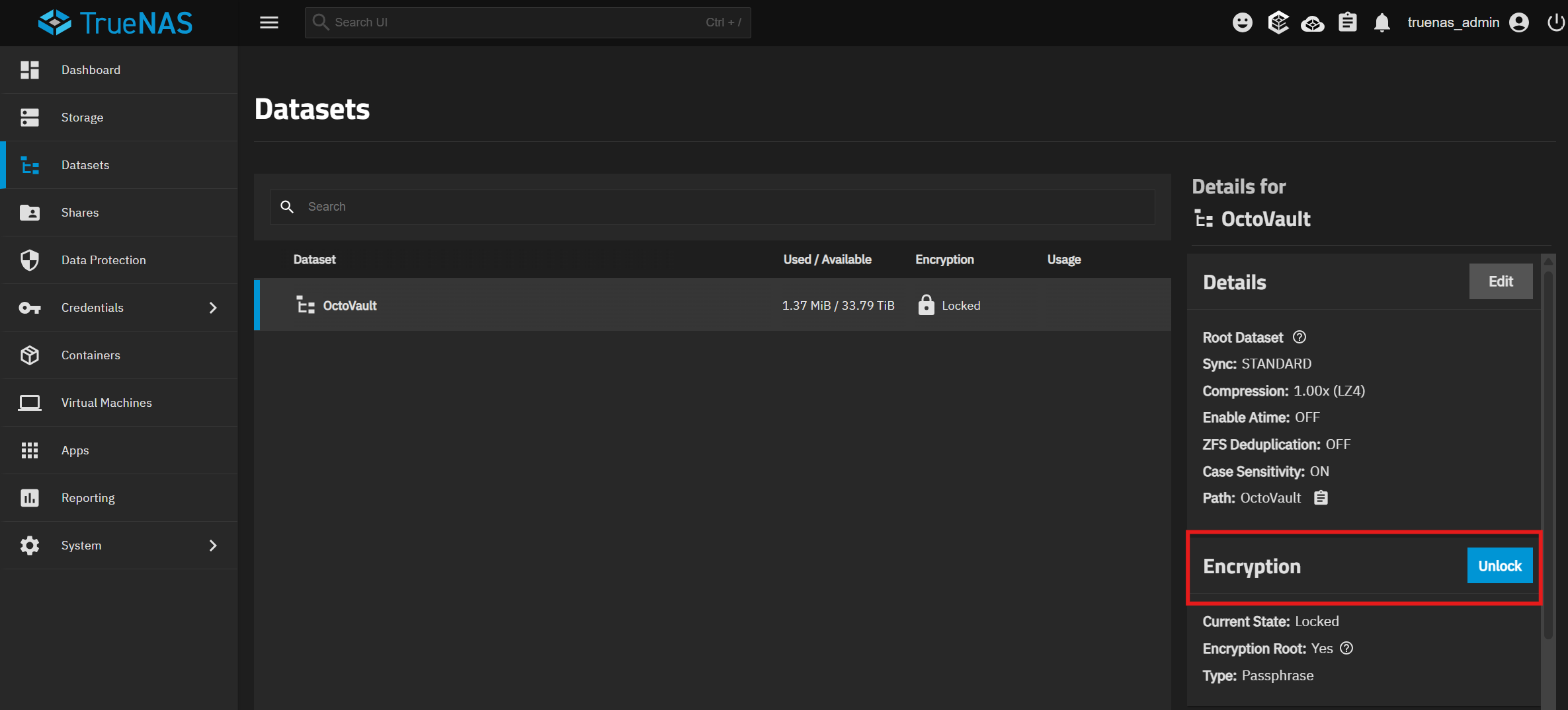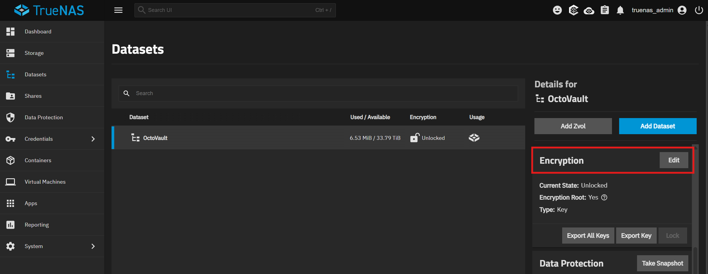 Initially the pool will be encrypted with a key, to change to passphrase go to Datasets - click on the pool name OctoVault - right bar menu Encryption and click Edit: