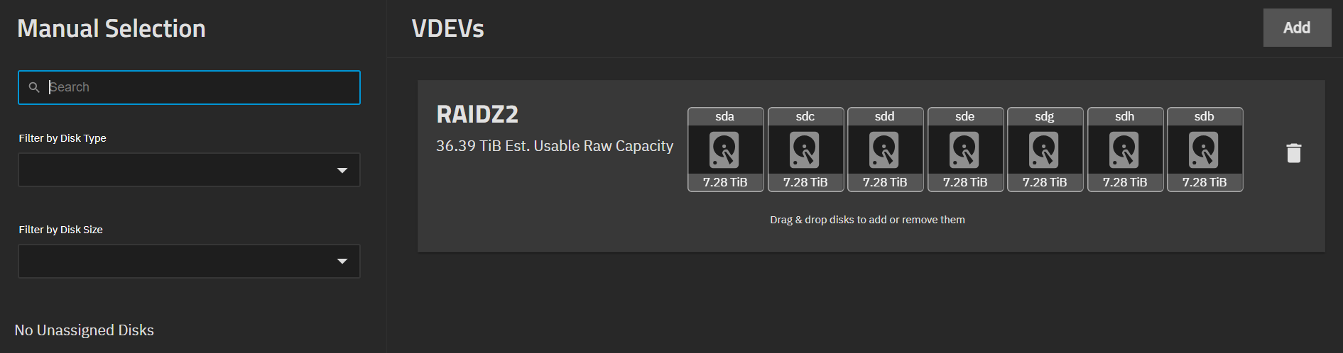 RAIDZ2 means there are 2 parity drives. I am using 7 of the 8 drives as the 8th drive will be used as a spare. Total capacity will be a bit over 37TB.