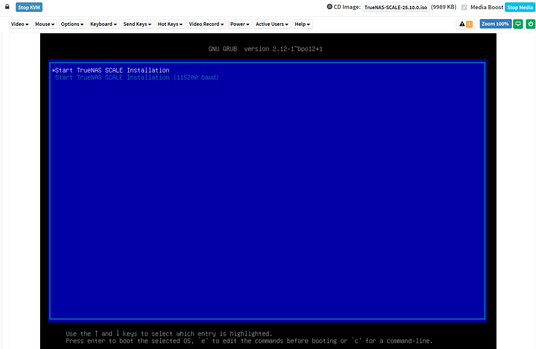 From the Remote KVM we can access the display, power on the server and mount the ISO image with TrueNAS downloaded from https://www.truenas.com/download-truenas-community-edition/