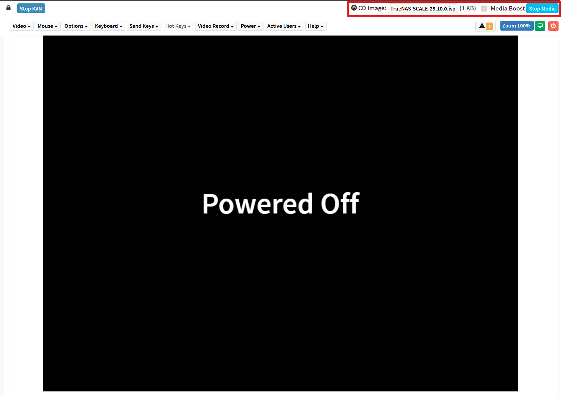 From the Remote KVM we can access the display, power on the server and mount the ISO image with TrueNAS downloaded from https://www.truenas.com/download-truenas-community-edition/